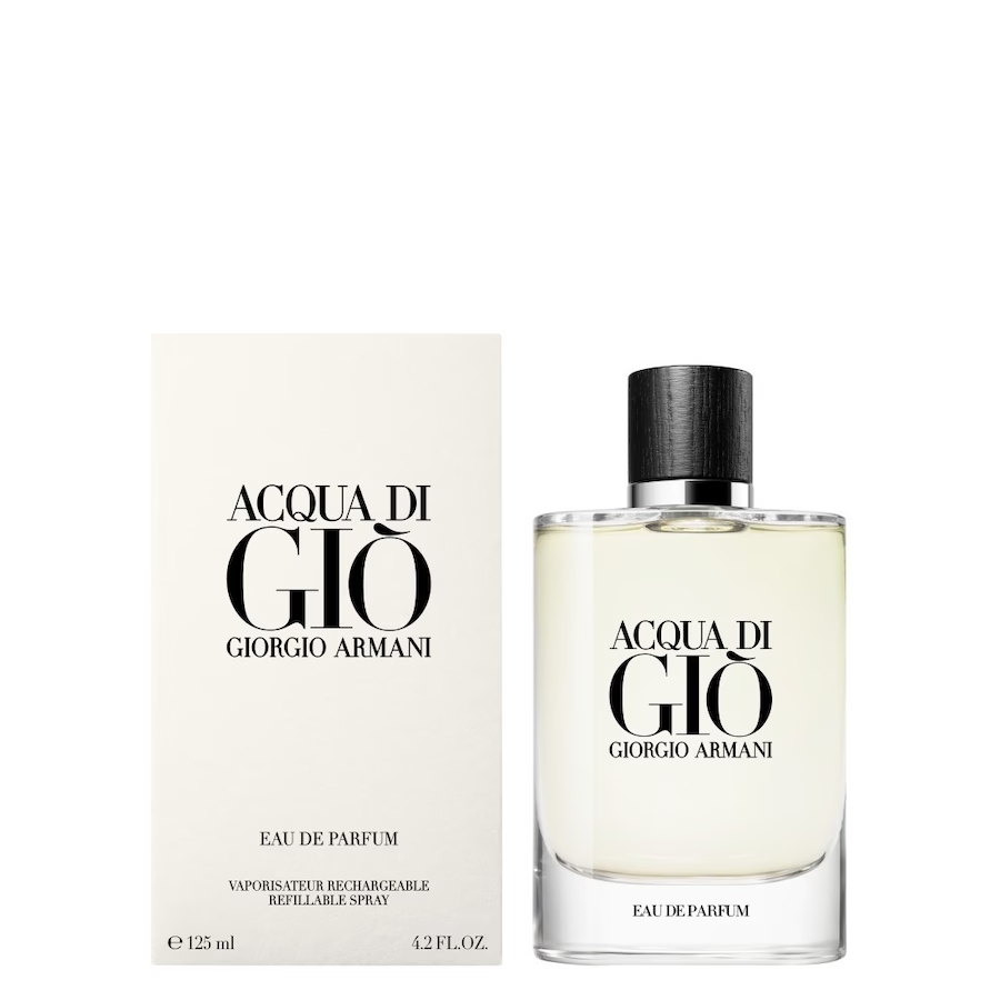 Acqua di Giò Eau de Parfum contains a powerful marine freshness, with innovative marine notes that mix with natural green mandarin, aromatic essences and a superficial mineral and woody scent. The infinite power of the sea enclosed in an innovative 100% refillable bottle.