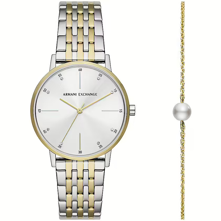 Box set composed of watch + bracelet by Armani Exchange Watch from the Lola collection for Women. The case is made of stainless steel with a polished finish. The case color is 2t silver / gold. The case shape is round and measures 6 mm. The dial is silver in color with a distance between the lugs of 18 MM. Stones: Crystals On The Dial The strap is made of stainless steel with a polished finish, 2t silver / gold in color. The clasp is: deployante clasp. Water resistance of 3 ATM. Movement: quartz / 3 spheres. The reference is: AX7156SET