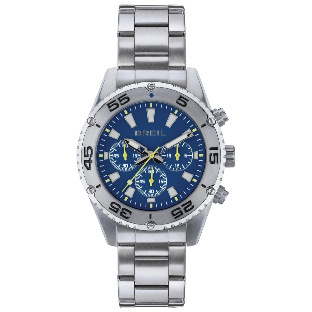 The Sprinter men's chronograph embodies all the features of a sports watch. Made of polished steel, it has a 43 mm case that makes it immediately visible on the wrist. The satin-finished steel bezel is decorated with easily legible numbers and the blue dial is rich in details: from the oversized indexes with luminous, to the yellow spheres that add a touch of color.