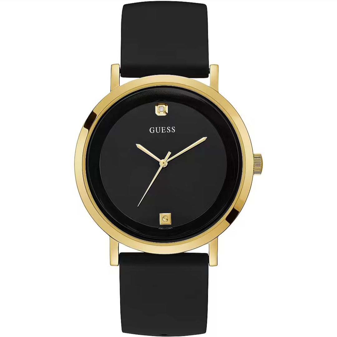 Guess men's time only watch. Watch with a 44mm diameter case in polished gold IP steel and a black enamel and diamond dial. Black silicone strap. Water resistance is 3 atm.